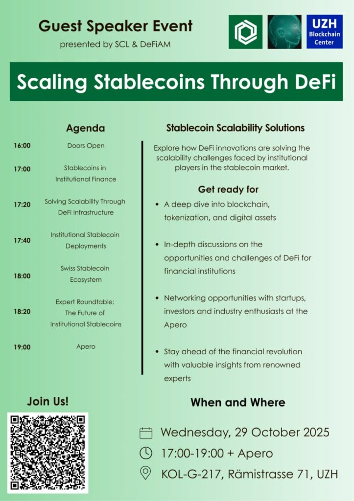 On Wednesday, 29 October 2025, SCL and DeFiAM will present an exciting guest speaker event at the University of Zurich, exploring how DeFi innovations are addressing scalability challenges in the stablecoin market.